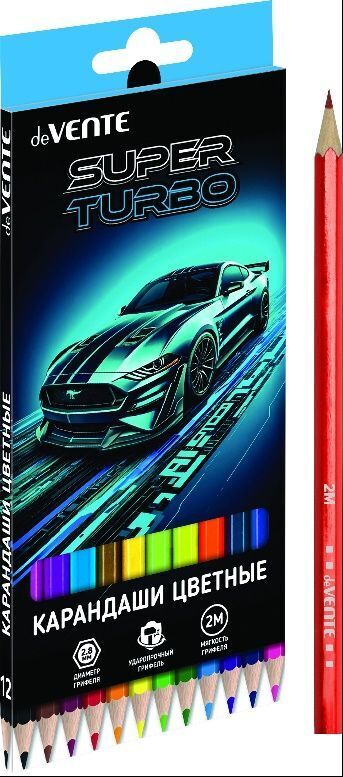 Карандаши цветные "deVENTE.Супер турбо"  12 цветов 2М, диаметр грифеля 2,8 мм, ударопрочный грифель, шестигранный корпус из натурального дерева. Яркие насыщенные цвета оставляют мягкие штрихи и ровно ложатся на бумагу. Карандаши помогут юным художникам развить мелкую моторику рук, цветовое восприятие, фантазию и воображение.