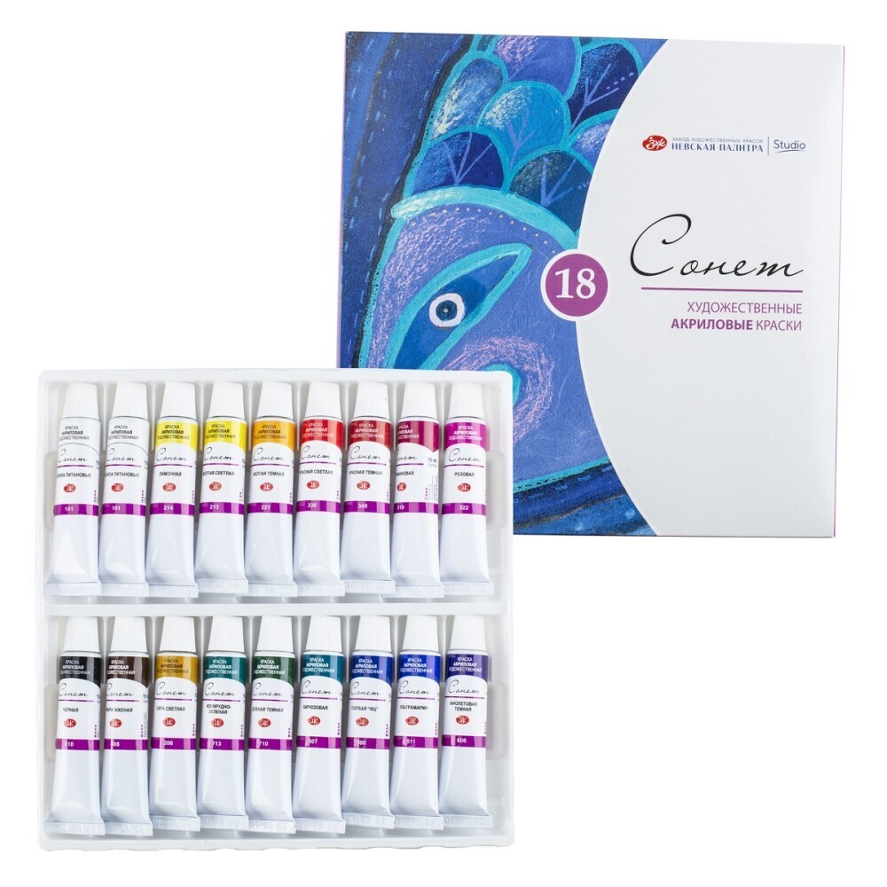 Художественные акриловые краски «Сонет» - качественный и доступный по цене материал для начинающих художников. Акрил «Сонет» предназначен для живописи и декоративно-прикладного творчества. Краски выпускаются по современным рецептурам. Отличаются яркостью и чистотой цвета, легко смешиваются с водой. Наносятся на бумагу, картон, грунтованный холст, дерево, металл, кожа, ткань. Предназначены для выполнения учебных работ, этюдов и эскизов. При высыхании образует эластичную несмываемую матовую пленку. Широкая палитра набора акриловых красок «Сонет» из 18 цветов дарит в тубах по 10мл максимальную творческую свободу самовыражения.