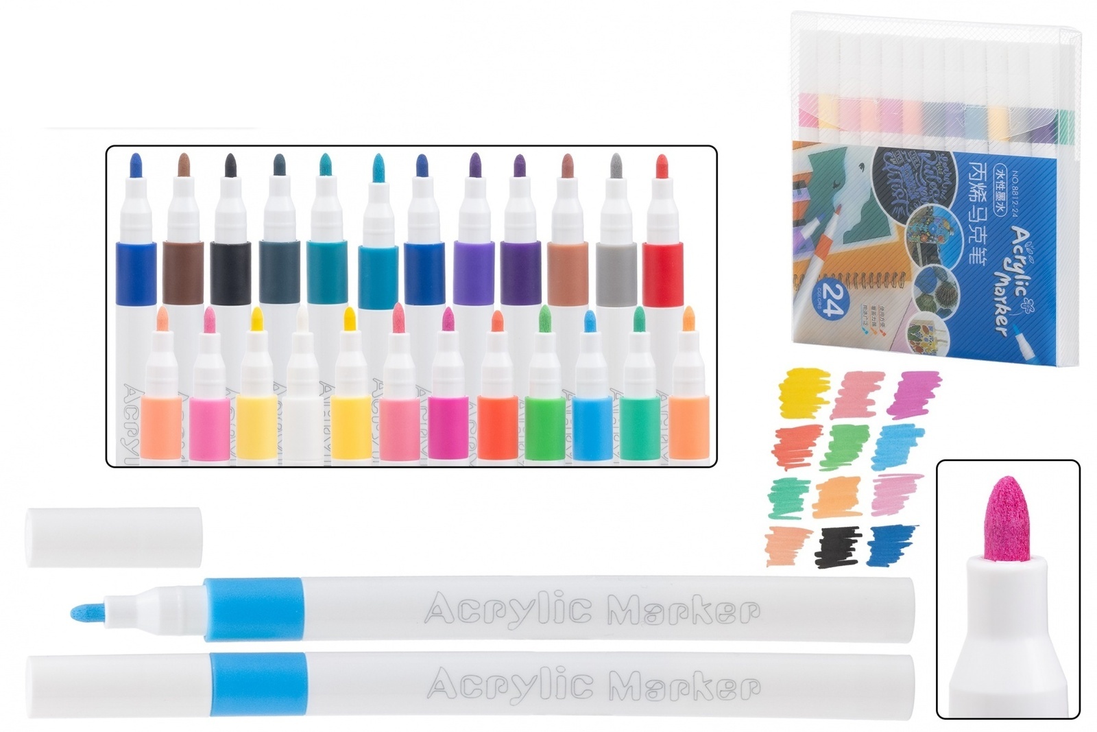 Набор маркеров-акриловые: на водной основе, укрывистые, толщина линии 1-2,4  mm, для любых поверхностей; круглый белый корпус /длина 13,2 см/, вентилируемый колпачок, пластиковая упаковка, 24 цвета. Маркеры имеют водную основу и при высыхании наконечник нужно поместить в теплую воду. Маркеры подходят для рисования по любой поверхности. Маркеры акриловые идеальный инструмент для иллюстраторов, студентов и всех, увлекающихся творчеством. Используются для создания эскизов, орнамента на кружках, одежде, зеркалах, текстиле.