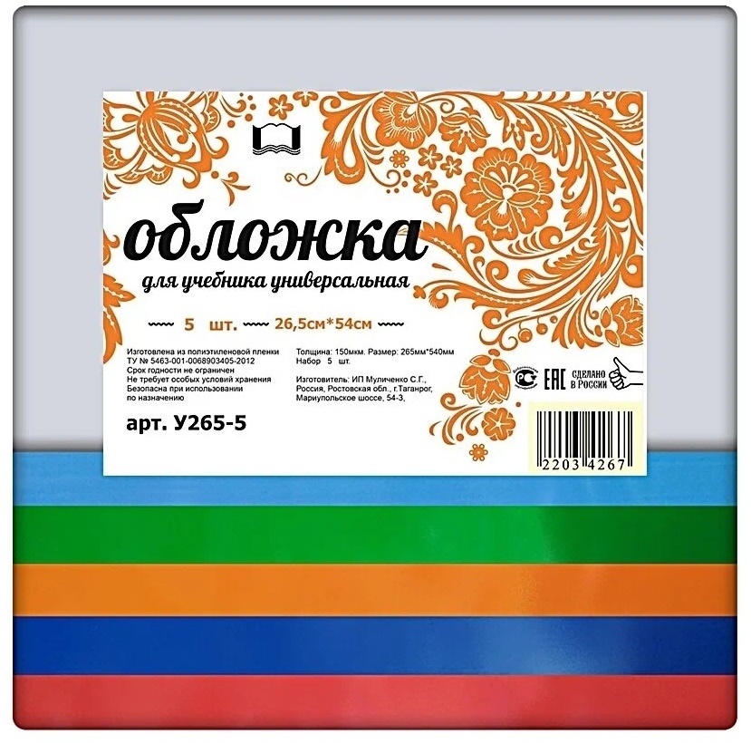 Набор обложек 265*540 5шт д/учебника Петерсон универс. 150мкм цветной клапан ПЭ У265-5