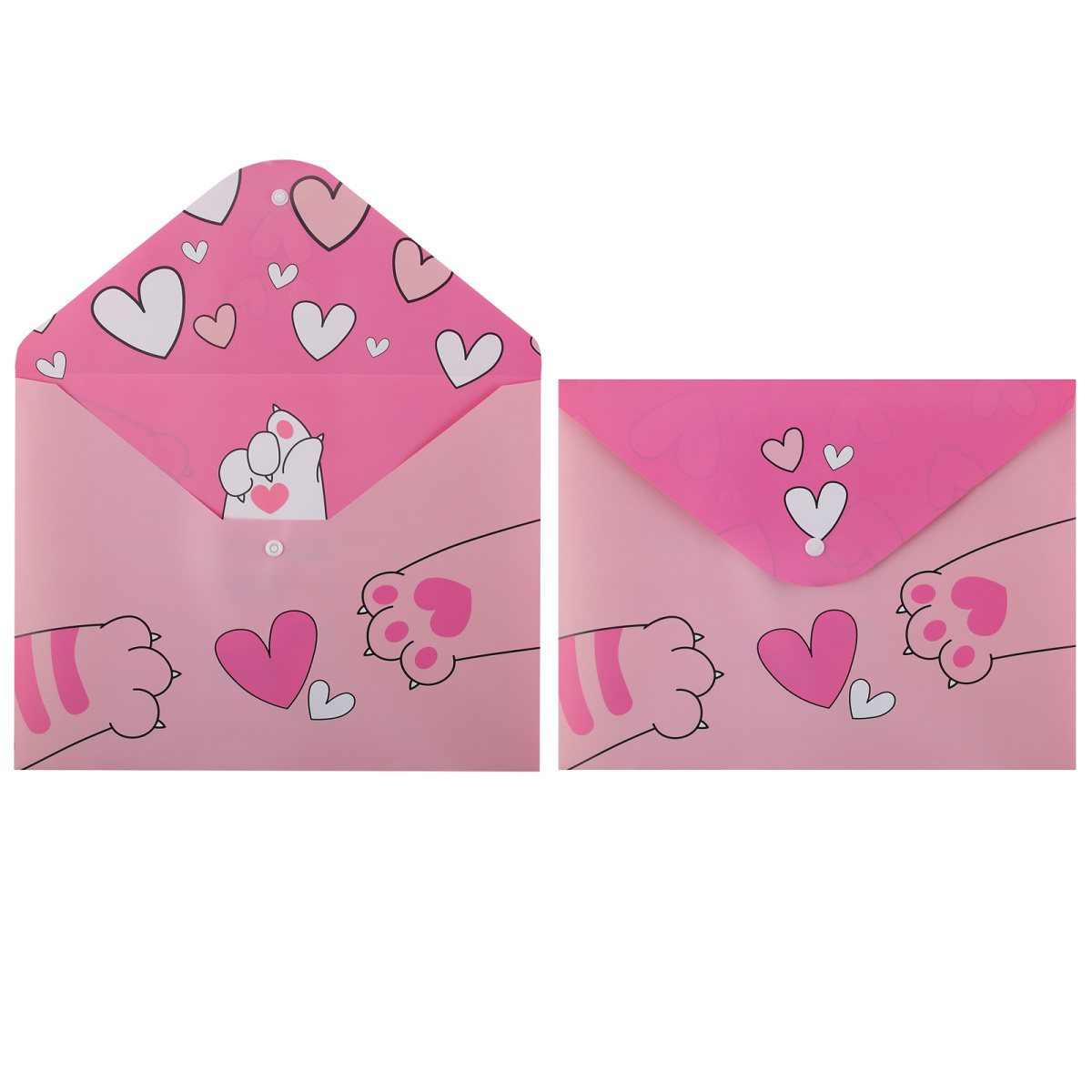 Папка-конверт на кнопке "Cats & Heart" формата А4 стильное и практичное решение для хранения и транспортировки документов. Изготовленная из полупрозрачного пластика толщиной 0,18 мм, она не только надежно защищает ваши бумаги от пыли и влаги, но и выглядит очень привлекательно. Размер 240*310 мм идеально подходит для листов формата А4. Милый рисунок кошачьих лапок добавляет папке очарования.