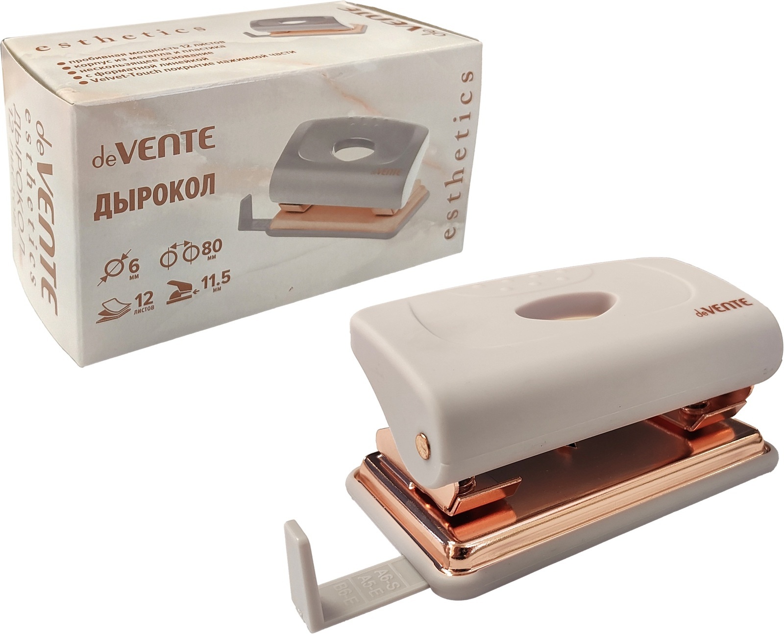 Дырокол 12л "deVente.Esthetics" лавандово/пепельный пластик с линейкой 4020516