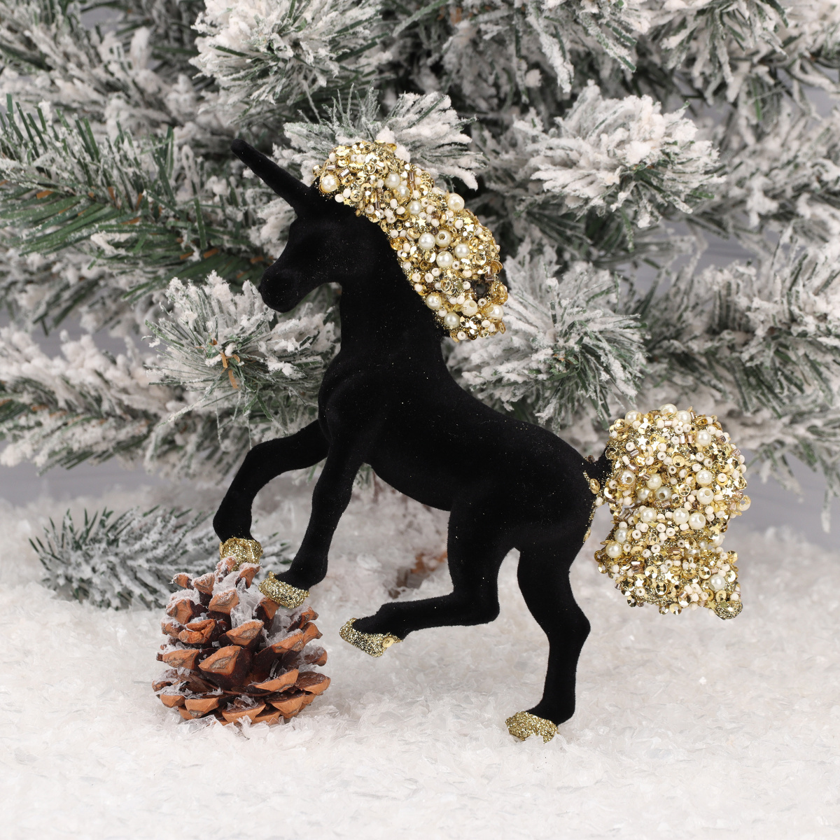 Елочная игрушка "Единорог" черный 16см пластик флок 231329