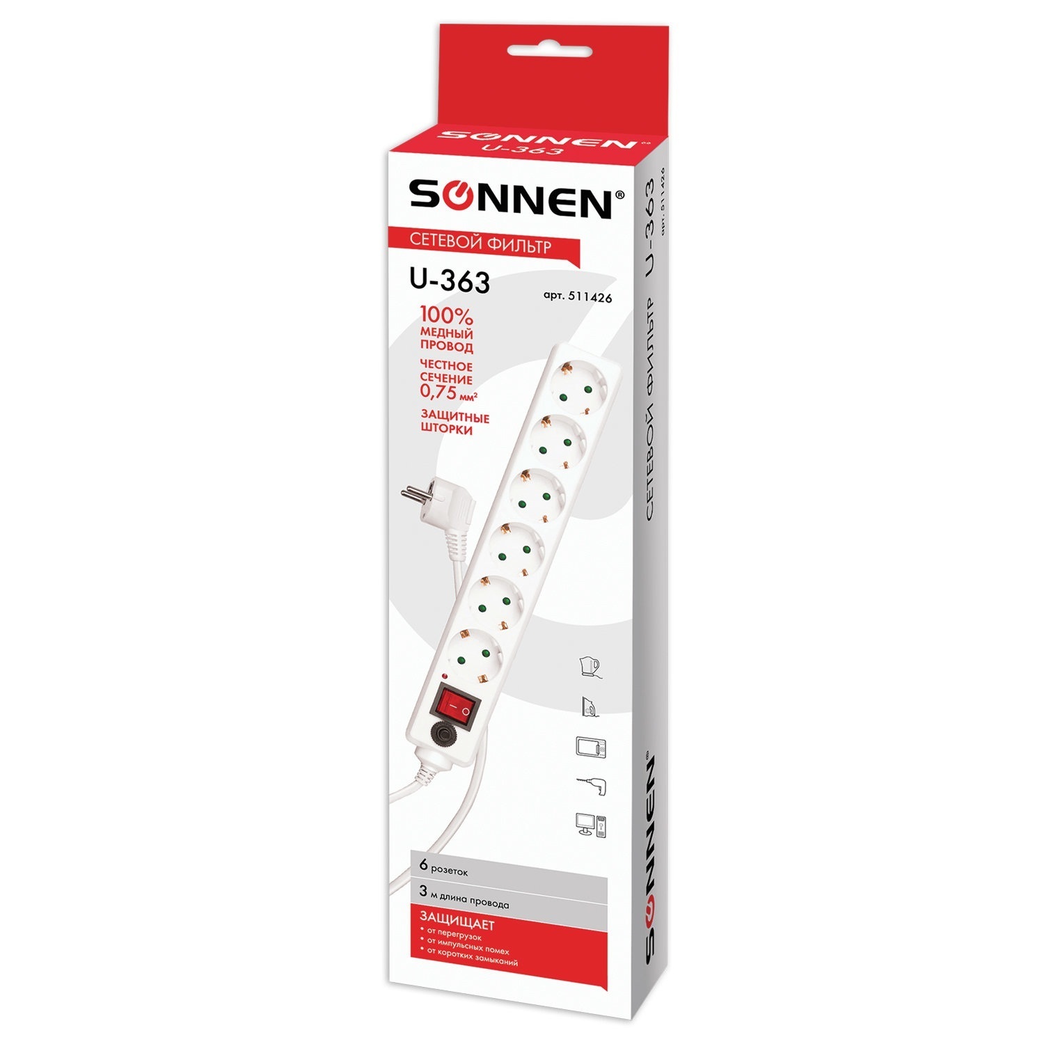 Высококачественный сетевой фильтр SONNEN U-363 – это простой, удобный и экономный вариант защиты электроприборов от негативных последствий перепадов напряжения. Устройство обеспечит бесперебойную работу любых электроприборов. Имеет возможность крепления на стену. Количество розеток - 6. Каждая розетка оснащена заземляющими контактами и защитными шторками. Корпус выполнен из негорючего ABS-пластика. На корпусе расположен выключатель и автоматический предохранитель. Толщина жил кабеля – 3х0,75 мм, длина кабеля – 3 м. Материал жил кабеля - медь. Номинальная частота – 50 Гц, номинальное напряжение – 220 Вт, максимальный ток нагрузки - 10 А, суммарная мощность нагрузки: 2200 Вт.
