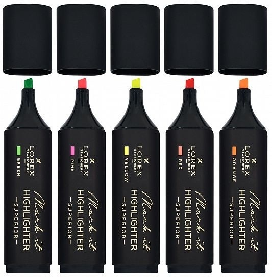 Текстмаркеры LOREX Mark it серии SUPERIOR – это пять ярких неоновых цветов в стильном корпусе, выполненного по технологии Ultra soft touch в абсолютно черном оформлении с фольгой цвета золота. Подходят для выделения в тексте, ежедневнике, тетради. Сделают акценты на самые важные моменты. Заглушка колпачка каждого маркера соответствует цвету чернил. Прочный наконечник не западает в корпус и сохраняет форму на протяжении всего срока службы маркера. Скошенный пишущий узел позволяет наносить линии толщиной от 1 до 5 мм.