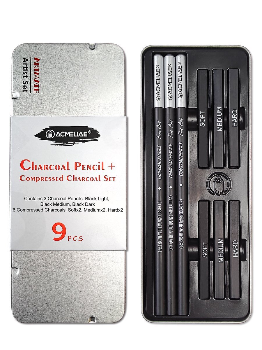 Набор высококачественных художественных угольных материалов для графики, 9 штук: черный угольный карандаш - 3 шт, прессованный уголь – 6шт. Металлический футляр. Универсальны в рисовании, обладают огромными возможностями в передаче света и тени. Удобны для проработки контуров и мелких деталей, скетчинга, эскизов, набросков, графики, портретов, живописи. Грифель мягко рисует по бумаге.